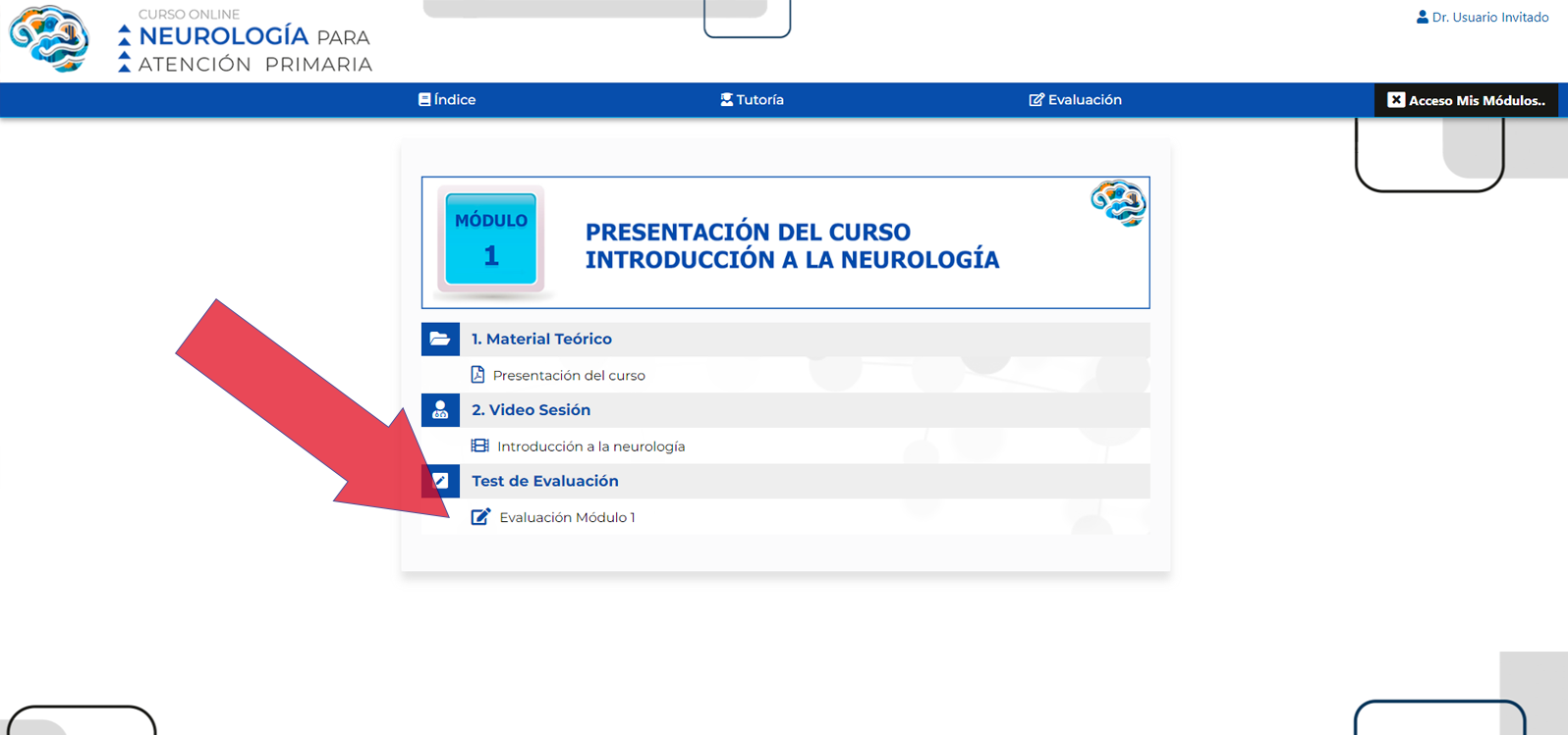 Al hacer click en "Evaluación", le llevará a la página donde podrá realizar el Test de Evaluación del curso en el que se encuentre.